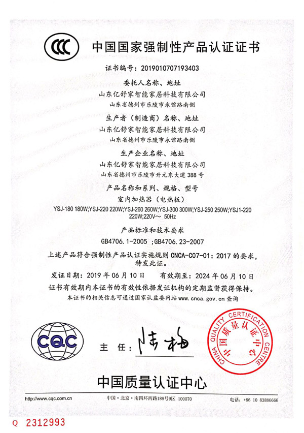 室內加熱器(電熱板)CCC認證證書